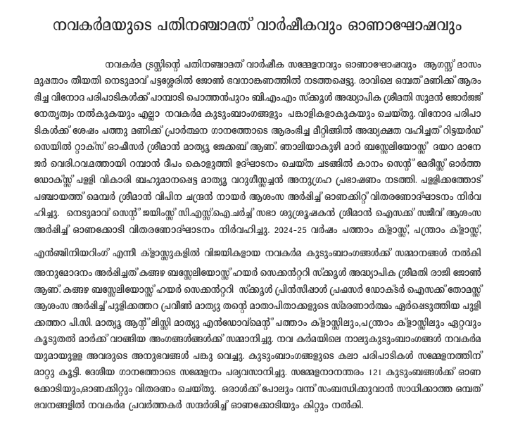 Twelfth annual meeting and Onam celebrations of Navakarma Trust was conducted on 6th September, 2022 at 9am in the premises of Pattasseril John Bhavan, Nedumavu. Before the public meeting variety entertainments ie arts and games were conducted.