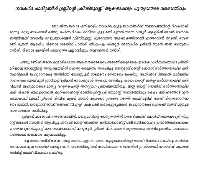 Navakarma family gathered on 23rd December 2023 at the premises of John Bhavan, Pattasseril, Nedumavu for Christmas celebration. Function began at 10a.m presided over by Sri. Mathew Jacob, (Retd. Sales Tax Officer). Smt Sosamma P.Thomas, Managing Trustee welcomed the audience and Rev.Fr Mathew Varghese, (Vicar, St.John’s Cathedral, Pampady) inaugurated the meeting by lighting the lamp. Rev.Fr.Das George, the vicar St.Mary’s C.S.I church, Kanam offered the Christmas message. Sri Issac Sajeev, Paster gave out the greeting message.